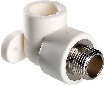 Комбинированный угловой фитинг с креплением (полипропиленовая водорозетка), предназначенный для подсоединения к полипропиленовому трубопроводу сантехнического смесителя или другого компонента инженерной системы с резьбовым подключением. Резьба фитинга – наружная трубная по ГОСТу 6357, 1/2".