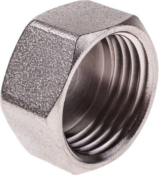(VTr.590.N) Латунная никелированная трубопроводная заглушка с шестигранной головкой. Имеет внутреннюю трубную цилиндрическую резьбу по ГОСТу 6357 (ISO 228, EN 10226), совместимую также с наружной конической трубной резьбой по ГОСТу 6211 (ISO R7).