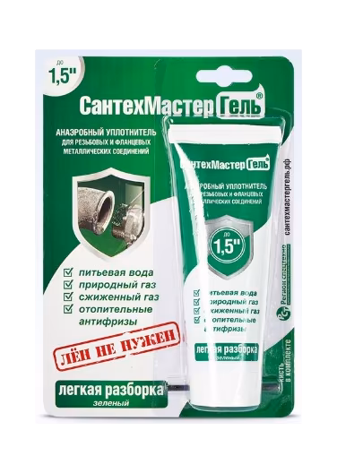 «СантехМастер Гель Зеленый» – легкоразборный (демонтаж соединений не требует усилий) герметик для новой и чистой резьбы. Используется для долгосрочного и временного уплотнения металлической резьбы диаметром до 1,5". Время полимеризации состава увеличено до 20–30 минут. Температура монтажа – от +15 °С.