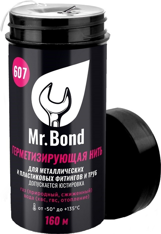 Герметизирующая нить общего применения из полимерных микронитей, пропитанная герметизирующим составом, для герметизации резьбовых соединений (согласно ISO 7/1) металлических и пластиковых труб и фитингов диаметром до 4" (стандартная трубная резьба) в системах питьевого и технического водоснабжения. Продукт готов к применению, наматывается на витки резьбы непосредственно из дозирующего контейнера, который служит одновременно как для хранения, так и для нанесения продукта. Mr. Bond® 607 рекомендован для промышленного применения в водных и неводных средах. Особенно удобен для сборки резьбовых соединений, которые требуют оперативного ввода узла в эксплуатацию, и может быть немного юстирован перед эксплуатацией (узел можно использовать сразу после сборки). Продукт рекомендуется применять при температуре до 149°C.