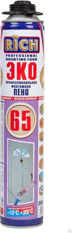 Монтажная пена Rich 65 Профессиональная всесезонная Монтажная пена Rich 65 обладает на 35% большим выходом под пистолет по сравнению с пенами других марок. Пена надежна в создании тепло- и звукоизоляции в помещения и адгезии с большинством рабочих материалов (металлы, древесина, бетон, камень и т.д.). Материал обладает низким вторичным расширением (0,25), что позволяет не деформировать конструкции, а также полным затвердеванием через 15 часов. Пена Rich сохраняет свои свойства при температуре от -10 до +35 градусов. Область применения: монтаж окон и дверей; изоляция дверных и оконных рам, труб; заполнение щелей и пустот; изоляция панелей и черепицы.