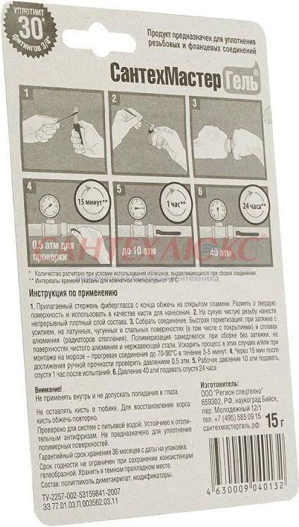 Анаэробный герметик для металлических резьбовых и фланцевых соединений. Образует высокопрочное уплотнение, устойчивое к различным средам: вода, природный и сжиженный газ, бензин, отопительные антифризы и др. "Сантехмастер Гель" — уплотнительный материал последнего поколения. Ранее такие материалы применялись только в сфере обороны, космоса и высокотехнологичного машиностроения, но в настоящее время получили широкое распространение благодаря продвижению на открытом рынке. Подойдет для труб диаметром до 1,5 дюймов. Соединение, собранное на "Сантехмастер Гель" легко демонтировать.