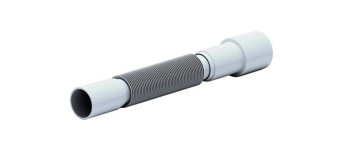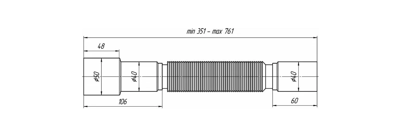 Благодаря наличию гофры, труба легко гнётся сохраняя форму и проходное сечение, а её длина может изменяться в диапазоне от 351 до 761 мм. Диаметр впускной части составляет 40 мм, выпускной – 50 мм. При необходимости подключения к канализационному входу диаметром 40 мм, часть выпускного патрубка Ø50 мм следует отпилить и зачистить заусеницы.