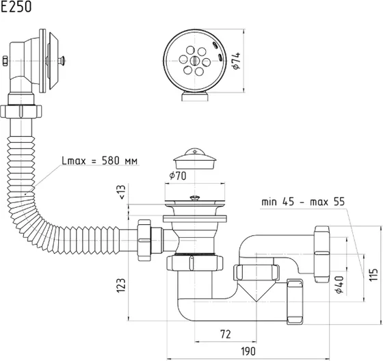 Сифон АНИ пласт Е 250 для ванны с выпуском, с переливом, регулируемый 1 1/2" СТ001775