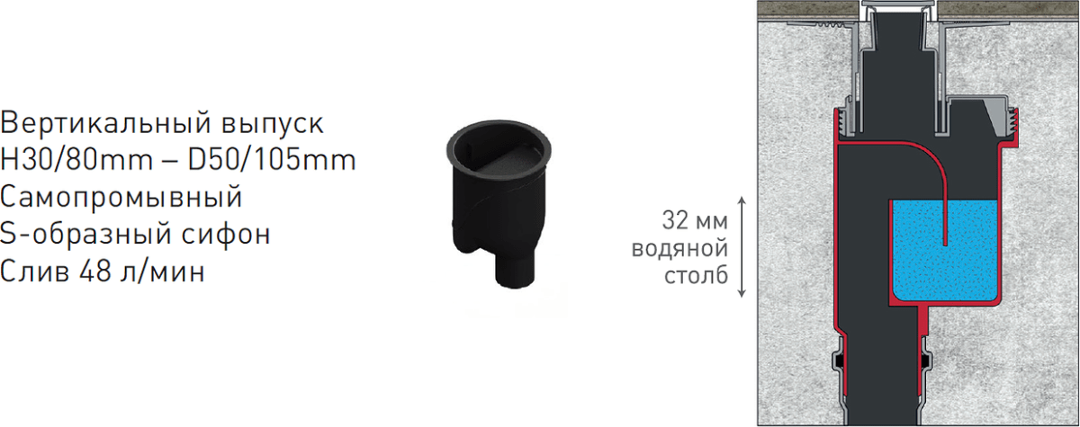| Решетка и желоб водосток, нержавеющая сталь AISI 304 Декоративная заглушка с сеткой для волос, нержавеющая сталь AISI 304 Переходник, PP Фланец PP c гидроизоляцией Самопромывной S-образный сифон PP: горизонтальный выпуск D50 H60, пропускная способность 42л/мин, монтаж 360° Монтажные углы и ключ, пластик |