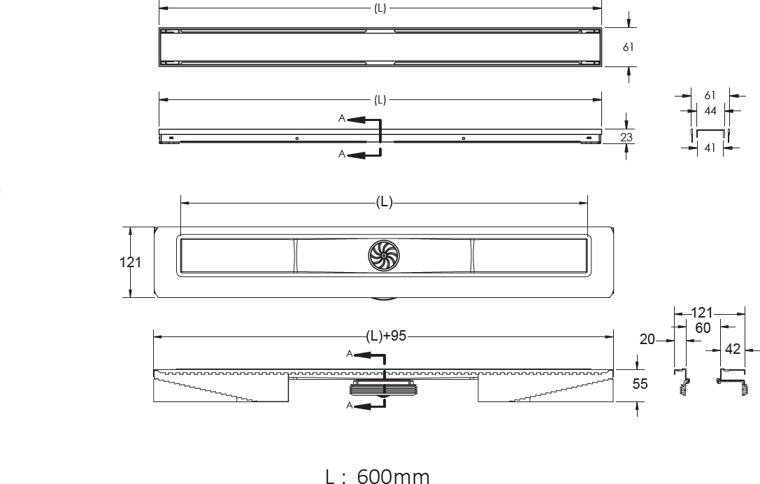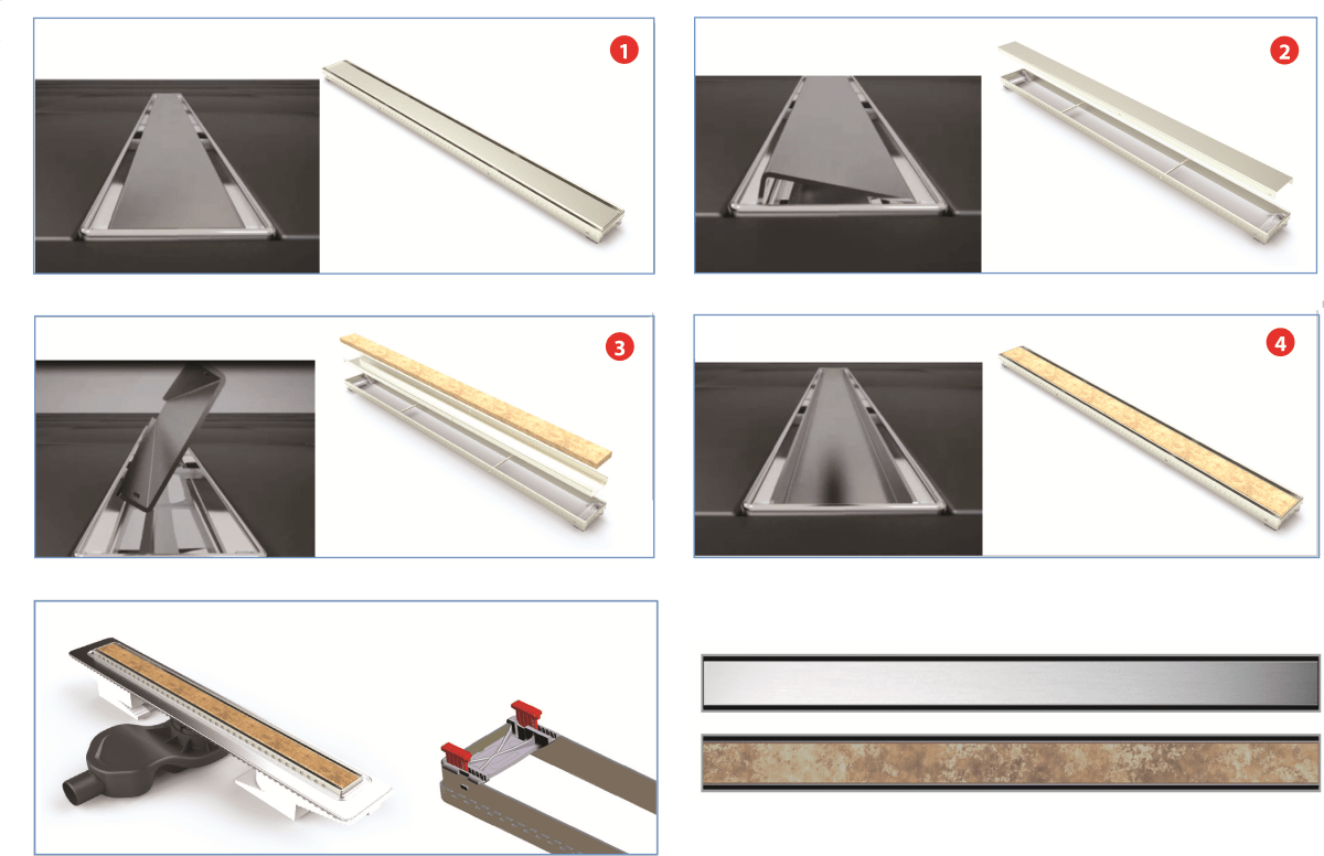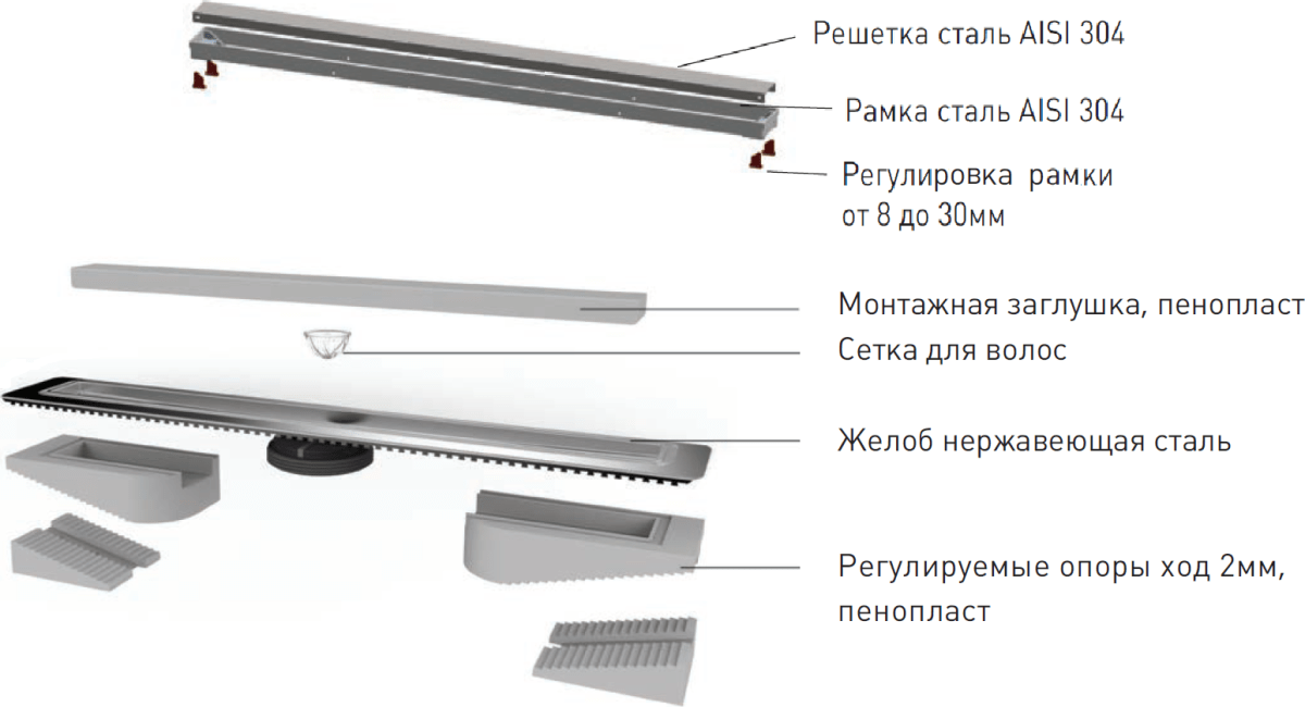 | Решетка и рамка, нержавеющая сталь AISI 304 Двусторонняя установка решетки: металл и вклейка плитки с регулировкой по высоте от 8 до 30мм Сетка для волос, пластик Комплект гидроизоляции Желоб водосток, нержавеющая сталь AISI 304 Монтажная заглушка и регулируемые по высоте ножки, пенопласт Самопромывной S-образный сифон PP: вертикальный выпуск, пропускная способность 48л/мин, монтаж 360° Монтажный ключ, пластик |