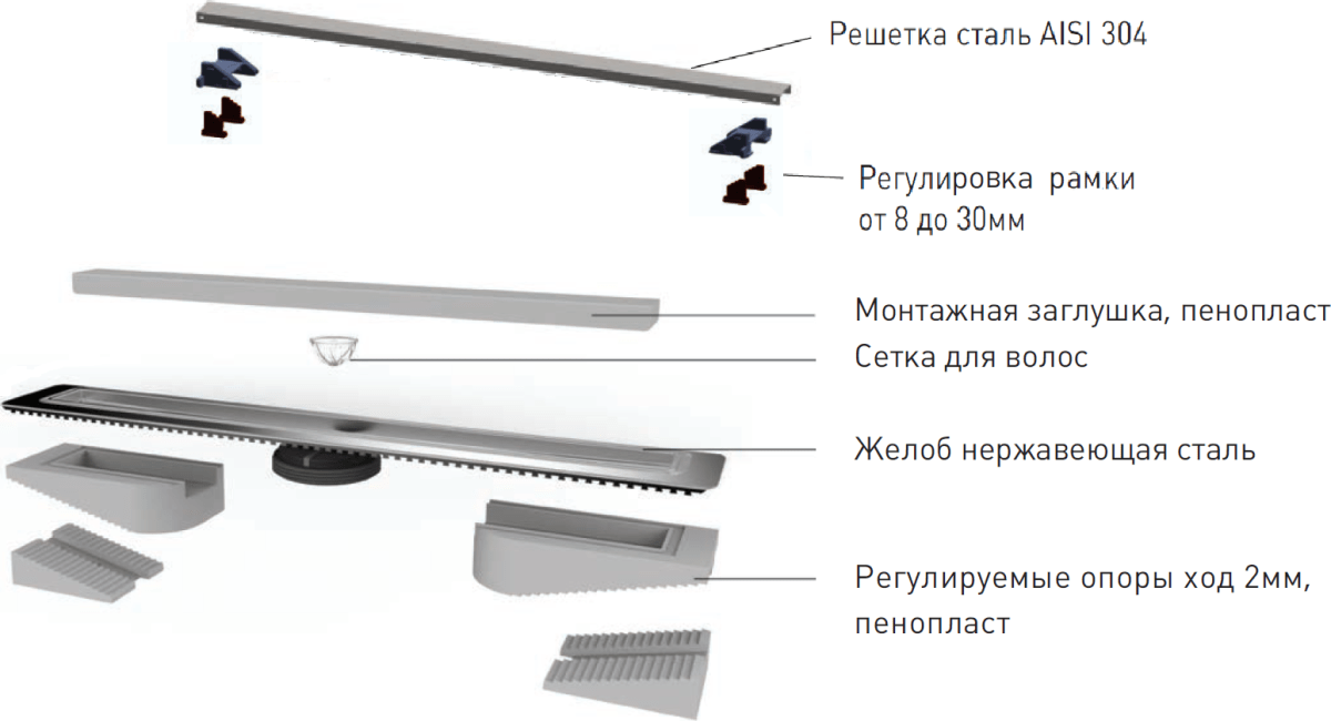 | Решетка и желоб водосток, нержавеющая сталь AISI 304 Двусторонняя установка решетки: металл и вклейка плитки с регулировкой по высоте от 8 до 30мм Комплект фиксации решетки, пластик Сетка для волос, пластик Комплект гидроизоляции Монтажная заглушка и регулируемые по высоте ножки, пенопласт Самопромывной S-образный сифон PP: вертикальный выпуск, пропускная способность 48л/мин, монтаж 360° Монтажный ключ, пластик |
