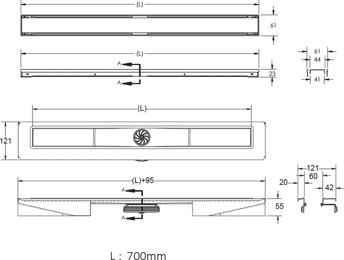 | Решетка и рамка, нержавеющая сталь AISI 304 Двусторонняя установка решетки: металл и вклейка плитки с регулировкой по высоте от 8 до 30мм Сетка для волос, пластик Комплект гидроизоляции Желоб водосток, нержавеющая сталь AISI 304 Монтажная заглушка и регулируемые по высоте ножки, пенопласт Самопромывной S-образный сифон PP: горизонтальный выпуск D50 H60, пропускная способность 42л/мин, монтаж 360° Монтажный ключ, пластик |