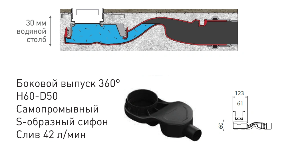 | Решетка и рамка, нержавеющая сталь AISI 304 Двусторонняя установка решетки: металл и вклейка плитки с регулировкой по высоте от 8 до 30мм Сетка для волос, пластик Комплект гидроизоляции Желоб водосток, нержавеющая сталь AISI 304 Монтажная заглушка и регулируемые по высоте ножки, пенопласт Самопромывной S-образный сифон PP: горизонтальный выпуск D50 H60, пропускная способность 42л/мин, монтаж 360° Монтажный ключ, пластик |