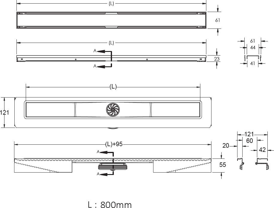 | Решетка и рамка, нержавеющая сталь AISI 304 Двусторонняя установка решетки: металл и вклейка плитки с регулировкой по высоте от 8 до 30мм Сетка для волос, пластик Комплект гидроизоляции Желоб водосток, нержавеющая сталь AISI 304 Монтажная заглушка и регулируемые по высоте ножки, пенопласт Самопромывной S-образный сифон PP: горизонтальный выпуск D50 H60, пропускная способность 42л/мин, монтаж 360° Монтажный ключ, пластик |