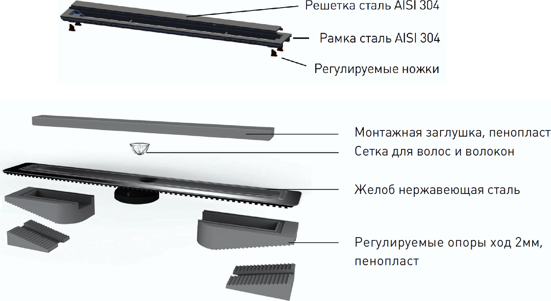 | Решетка и рамка толщина 3мм, нержавеющая сталь AISI 304 Комплект регулировки высоты от 12 до 32мм Сетка для волос, пластик Комплект рулонной гидроизоляции Желоб водосток, нержавеющая сталь AISI 304 Монтажная заглушка и регулируемые по высоте ножки, пенопласт Самопромывной S-образный сифон PP: горизонтальный выпуск D50 H60, пропускная способность 42л/мин, монтаж 360° Монтажный ключ, пластик |