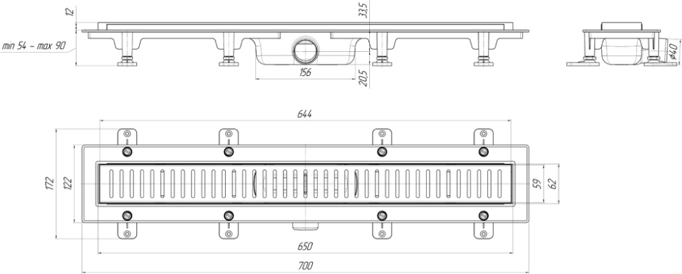 Трап пластиковый линейный сухой 650х62, диаметр выпуска 40 мм, решетка нержавеющая сталь, матовая