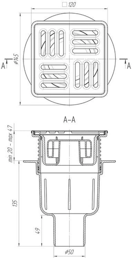 Трап АНИпласт TQ5714M вертикальный регулируемый с выпуском 50 мм, с нержавеющей решеткой 120 х 120, сухой УТ-00008251