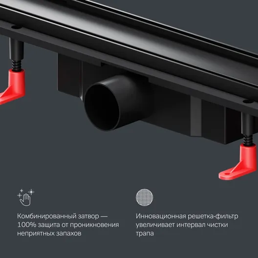 Продукт обладает низкой высотой монтажа и возможностью регулировки что предполагает экономию бюджета при заливке пола. Трап имеет инновационную конструкцию решетки с фильтром что значительно увеличивает межсервисный интервал.