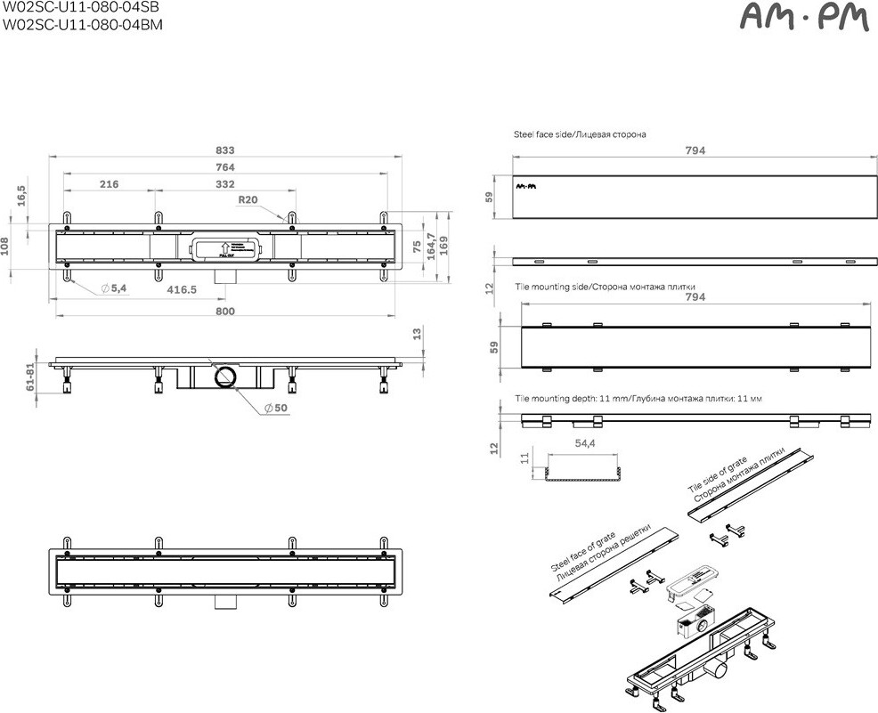 Душевой лоток Am.Pm PrimeFlow W02SC-U11-080-04BM затвор Tile 80 черный матовый