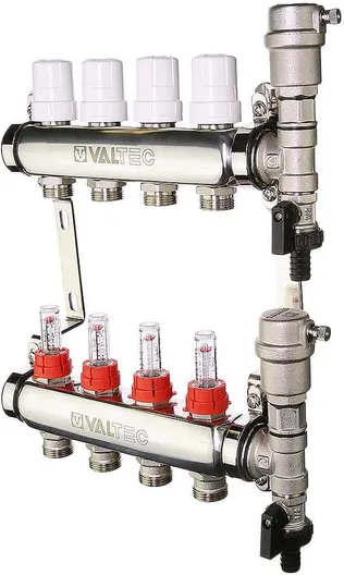 Условный диаметр коллекторов – 1". Резьба выходов – наружная, 3/4". Присоединение циркуляционных петель осуществляется с помощью фитингов стандарта «евроконус».