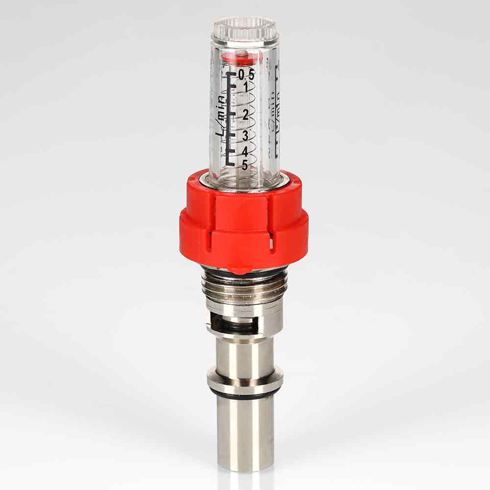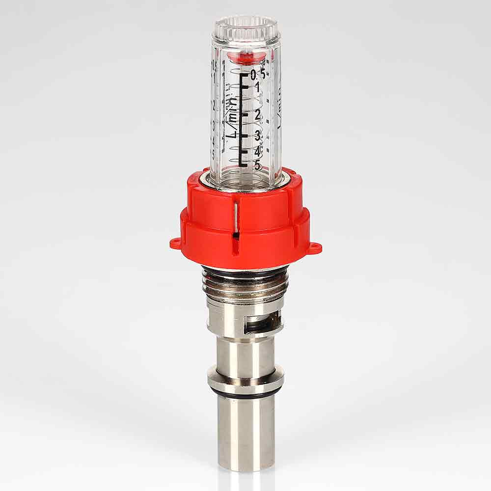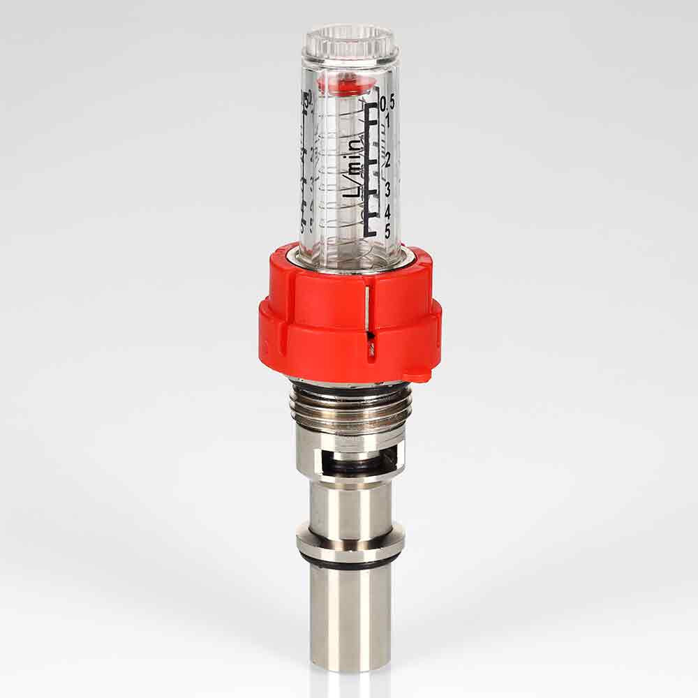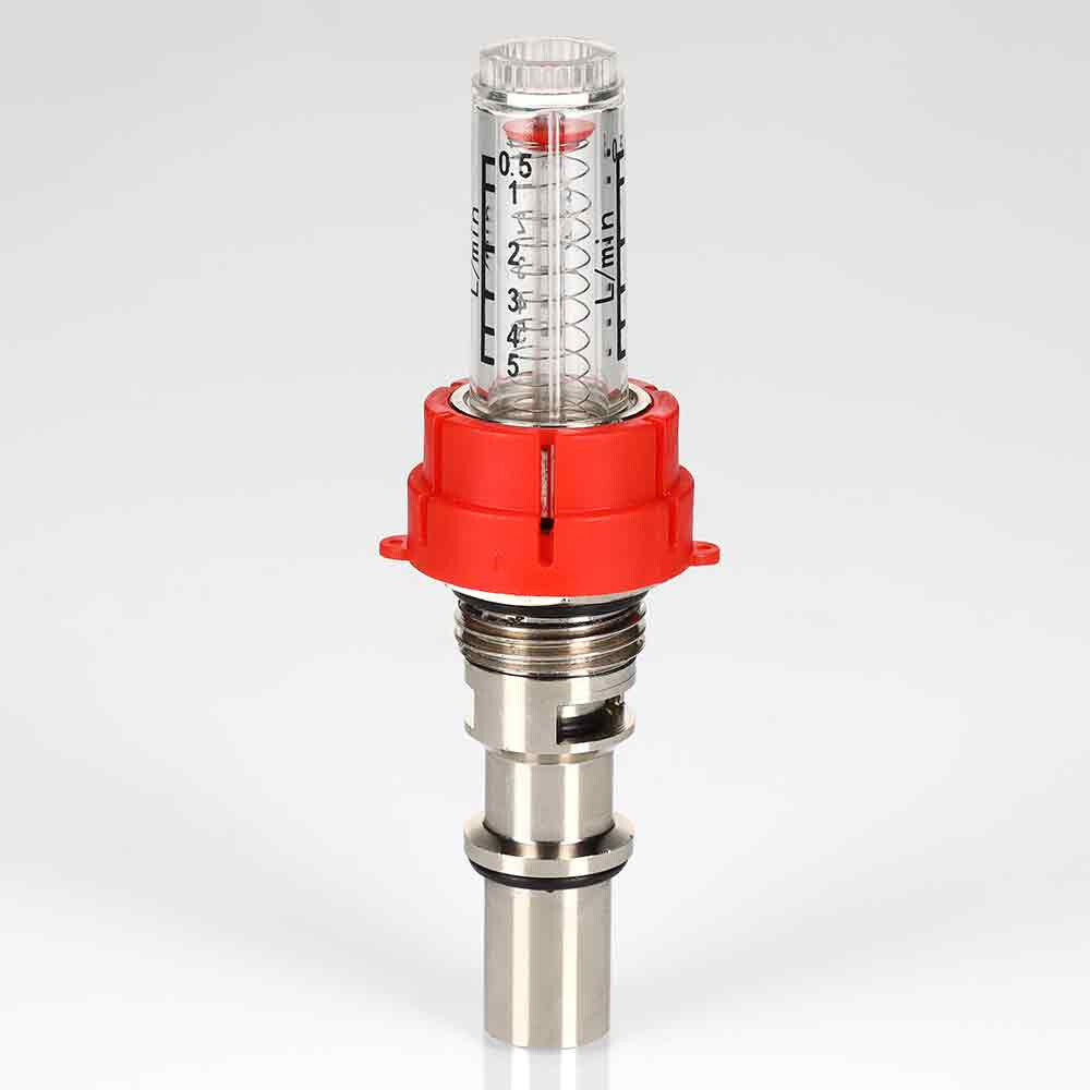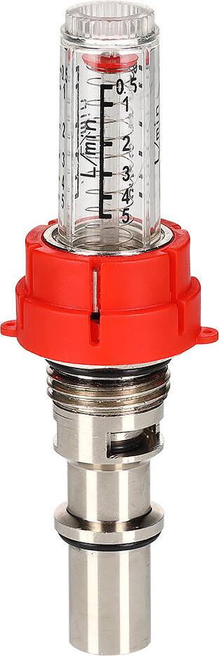 (VT.AC674.V) Настроечный клапан с расходомером (ротаметром) для коллекторных блоков VTc.589. Предназначен для индикации и регулировки расхода теплоносителя в присоединенных контурах напольного или радиаторного отопления при наладке (гидравлической балансировке) системы. Шкала прозрачной колбы отградуирована в диапазоне расхода от 0,5 до 5,0 л/мин. Текущее значение расхода определяется по положению индикаторной шайбы. Расходомер можно разобрать и прочистить при загрязнении.