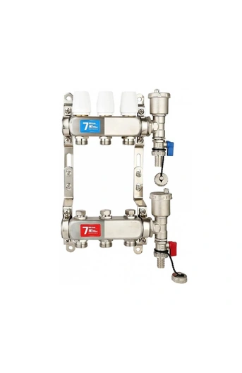 Корпус коллектора ViEiR производят из нержавеющей стали и максимально устойчив к агрессивным средам. Это значит что такая коллекторная группа подойдет для работы с антифризами и незамерзающими жидкостями. Коллектор имеет наружную и внутреннюю резьбу на 1". Соединение фитингов осуществляется на уплотнителях выполненных из EPDM резины, что значительно упрощает сборку и монтаж. Коллекторы оснащены отверстиями на 3 выхода диаметром 3/4" под евроконус. Коллекторная группа оснащена воздухоотводчиком с терминальным узлом, который представляет собой прибор для автоматического удаления газов, объединенный в одном узле с краном для слива или наполнения жидкостью системы.