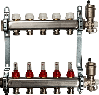Распределительный коллектор состоит из подающей и обратной гребенок. Подающая гребенка имеет возможность отключения (перекрытия) каждого отдельного контура системы отопления, оснащается расходомерами. Обратная гребенка оборудуется терморегулирующими клапанами с предварительной настройкой пропускной способности.