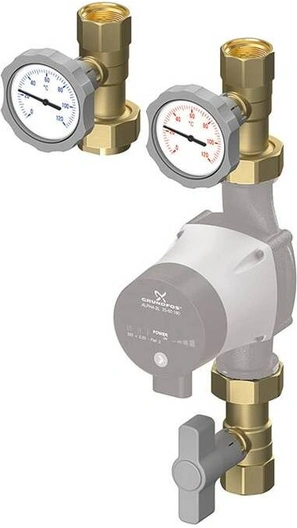 1x изолируемый шаровой кран (тип C) с термометром в ручке, двумя накидными гайками и уплотнениями.