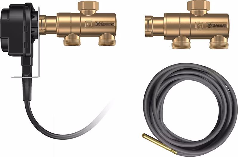 - Комплект устройств. Thermex dLine состоит из трех основных частей - трехходовой клапан с сервоприводом, который обеспечивает переключение направление потока теплоносителя, гидравлический трехходовой клапан, который дублирует работу первого устройства на обратной линии, и датчик температуры для внутреннего бака водонагревателя, который контролирует уровень нагрева воды в системе ГВС.